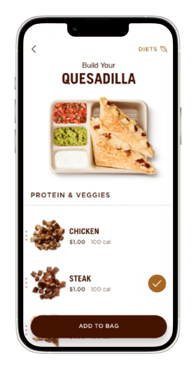 The app allowed users to personalize their meals, just like they would in-store. Customers could choose their toppings, protein, fillings, and sauces to create their perfect burrito, bowl, taco, or salad.